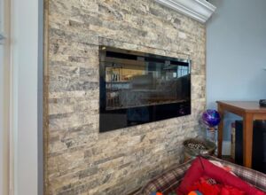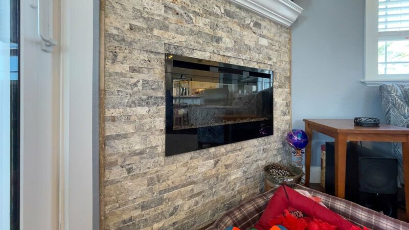 - Built-in Dimplex electronic fireplace with rough brick “stone” surround